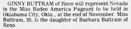 Ginny Buttram, 20, is the daughter of Barbara Buttram of Reno. Ginny is a junior in college and works for the Rodeo Association.