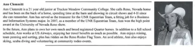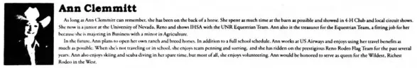 A bright, intelligent and caring young lady, Clemmitt enjoys being able to give back to her community with her involvement with the Black Stallion Literacy Project, the Reno Rodeo, and supporter of the “Mom’s on the Run” Breast Cancer Awareness Program. She participates in several fundraisers throughout the year.